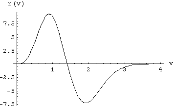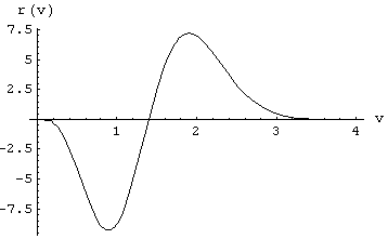 0 = 104, VM=1, m = 2, s = 1In this second evaluation of r(v) the number m of Simple particles making the CP (source of the redistribution) has been chosen m=2 (instead of m=1). This has the effect to multiply the whole function by 2 and it then happens that the redistribution of Fig 1-48 is approximately the negative of the redistribution of Fig 1-49. It is in this line that the model aims to explain the hypothesis r